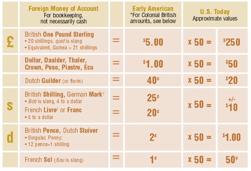French livres, francs and Spanish pistareens* were 5 to the dollar instead of 4. For easier math you can use their value, about 20¢, for all. .20 x 50 = $10.00 modern.